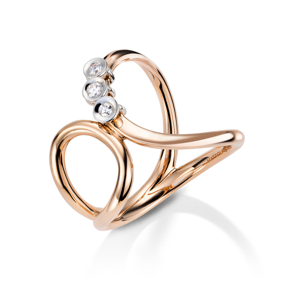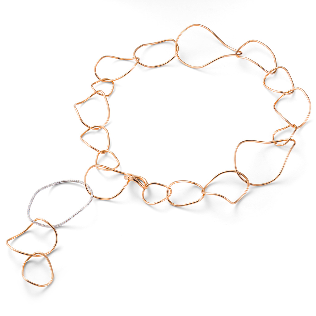 Forme leggere e ondulate ispirate alle chips americane soddisfano i gusti più raffinati. La collezione Chips comprende collane lunghe e fluide, orecchini leggeri, bracciali sinuosi e delicati anelli in oro rosa e bianco.