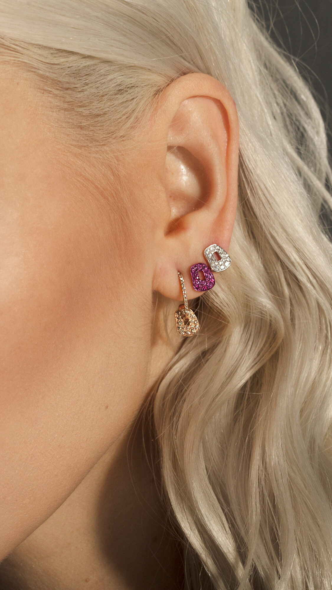 Orecchini Mini Puzzle in oro rosa, pavé di diamanti bianchi e due mini puzzle colorati